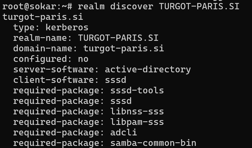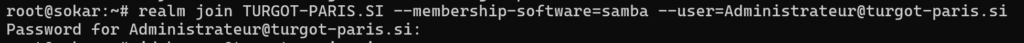 root@sokar:~# realm join TURGOT-PARIS.SI --membership-software=samba
