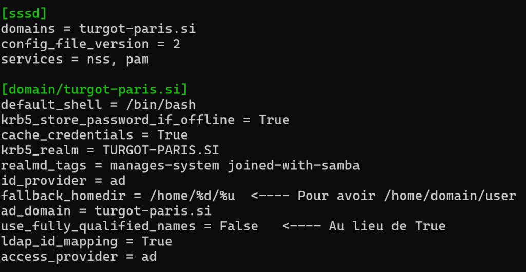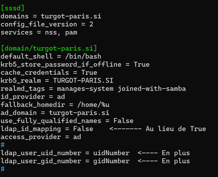 Les UID/GID des utilisateurs AD sont attribués de manière aléatoire, mais si on souhaite attribuer un UID/GID fixe, il convient de configurer comme suit :